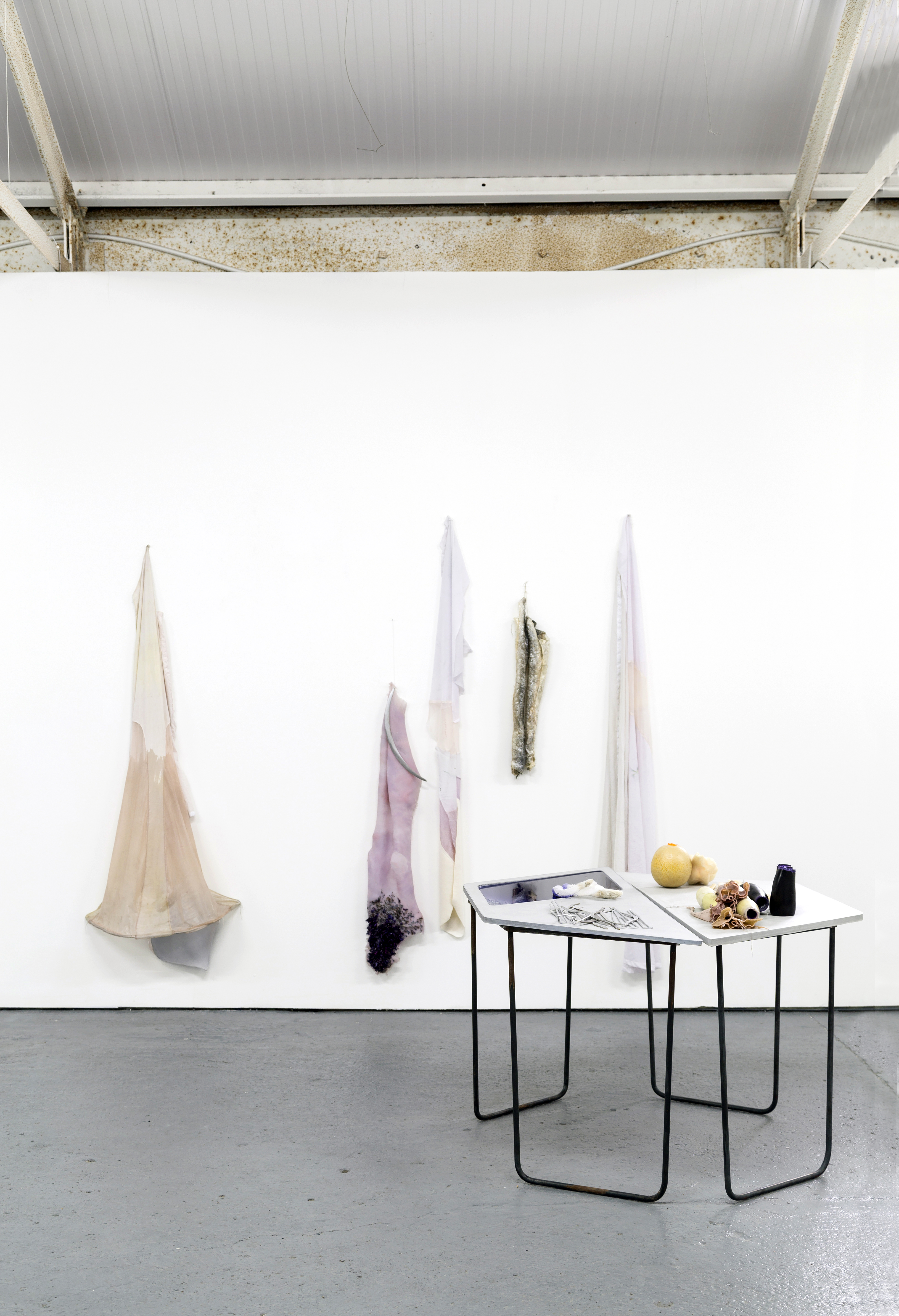 Lupercalia (Station 7), 2016, 320 x 250 x 350cm approx. Platinum silicone, steel, jesmonite, silk, potassium aluminium sulphate, ceramic, wax, resin, salt, dried brugmansia, algae, aluminium, aubergine, egg yolk, conch shell, salt water.