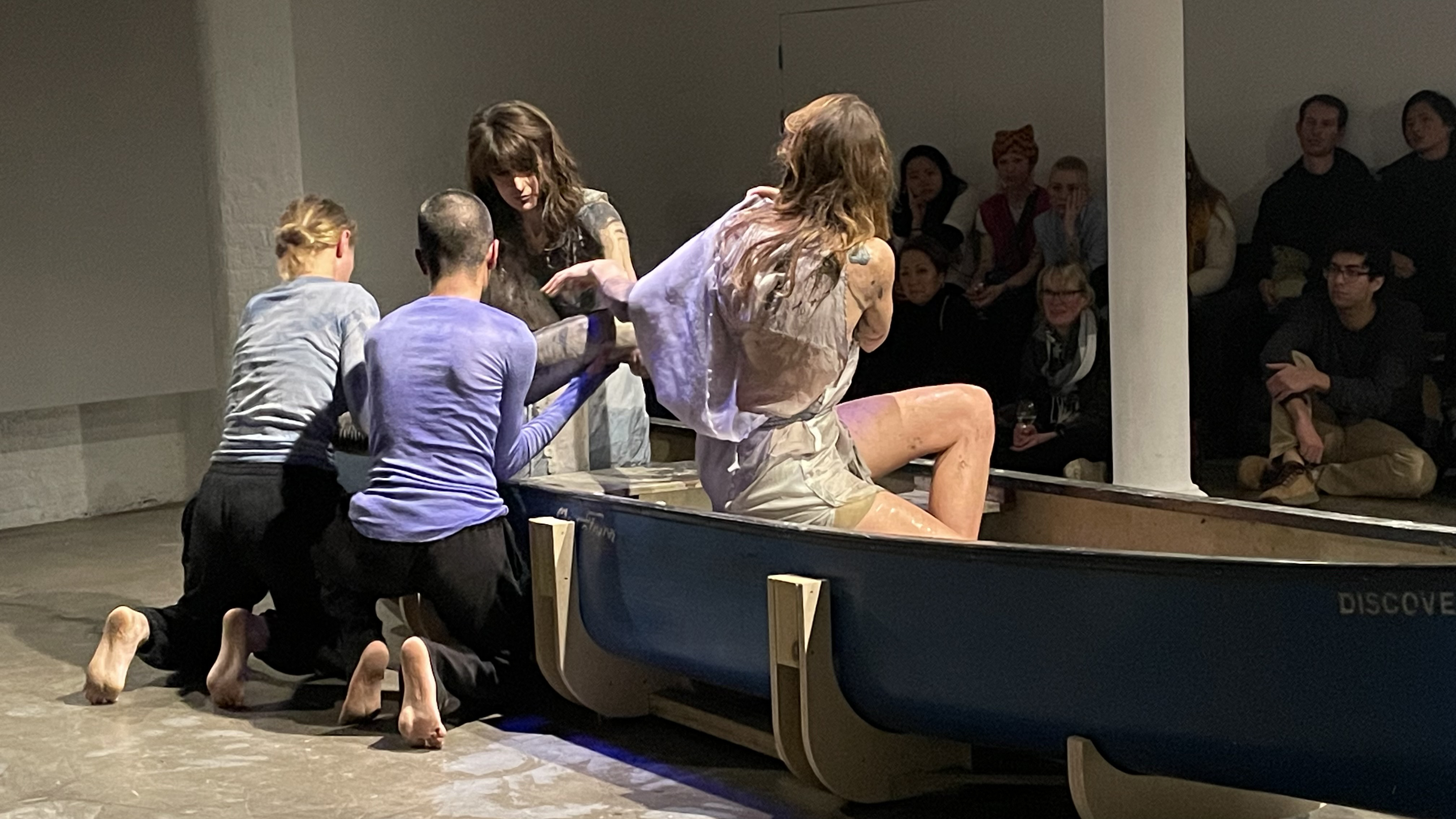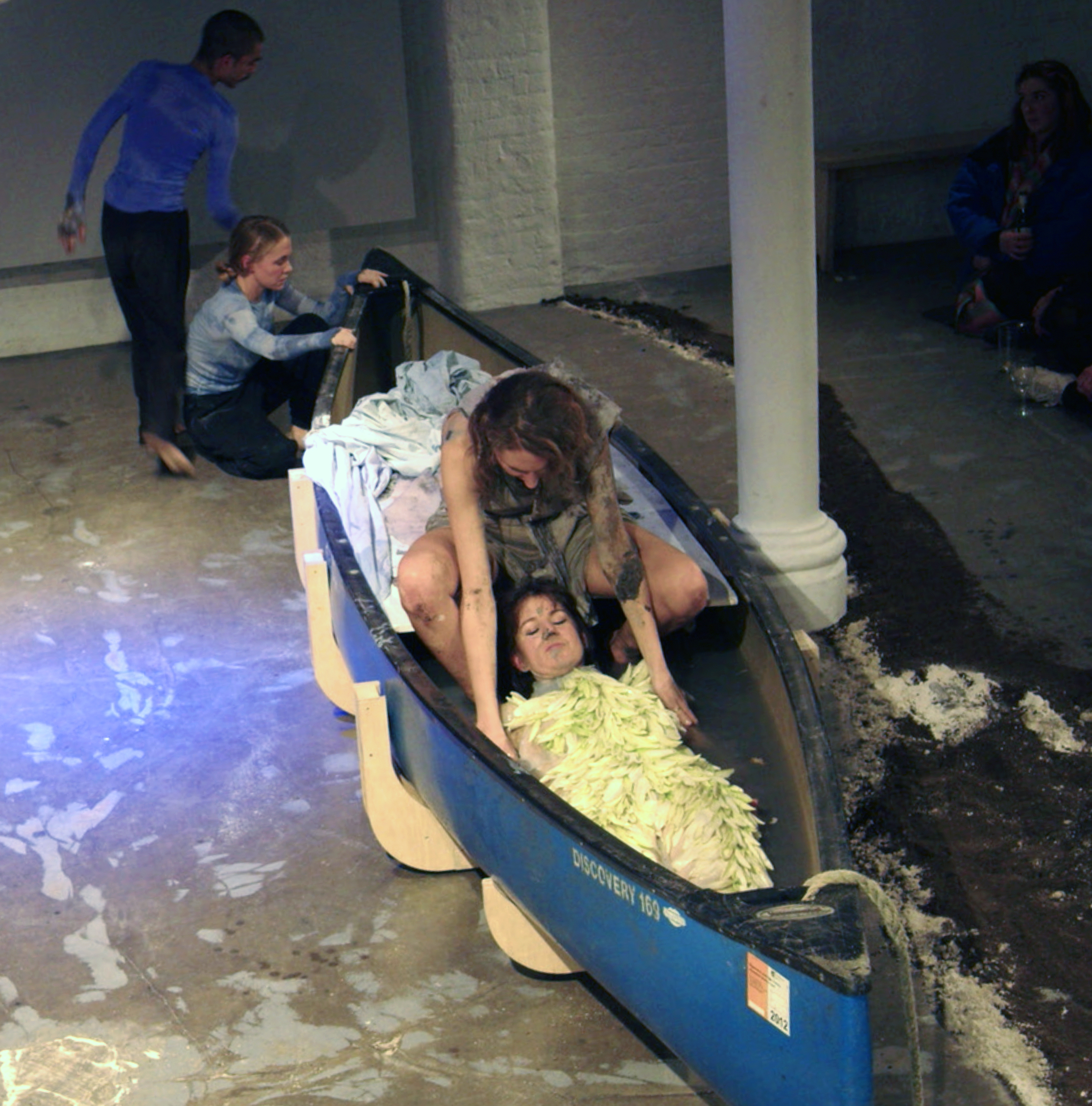 Working in collaboration with the musician/ sound artist and performer Lizzy Laurance, Miriam Austin presents a performance that emerges from the ancient fen wetlands of East Anglia, and the miraculously preserved body of Saint Aethelryth, Abbess of the first Cathedral at Ely. Drawing on Austin’s research into the history and ecology of the fens, SEAXBURH weaves together stories of human and more-than-human encounters: the body and the landscape, the wood and the water, the river and the eelskin. The sequence depicts the meeting of Aethelryth and a figure from the future fenlands, after the sea has risen. Peat, chalk, lilies, limestone and eel fat accrete over bodies held by the water. Unknowable birth is narrated by the gathering silt; the feathered figure born into adulthood joins with the Saint who heals in her tomb.