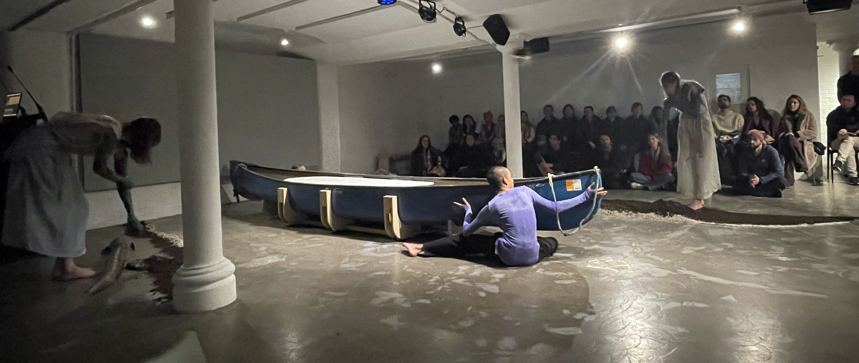 SEAXBURH is an unfolding work in four chapters that encompasses video and performance. The first chapter was realised as a live performance took place at Modern Art Oxford, involving a large conger eel. It was performed by Miriam Austin, Stephanie Hartop, Lizzy Laurance and Harmanpreet Randhawa.