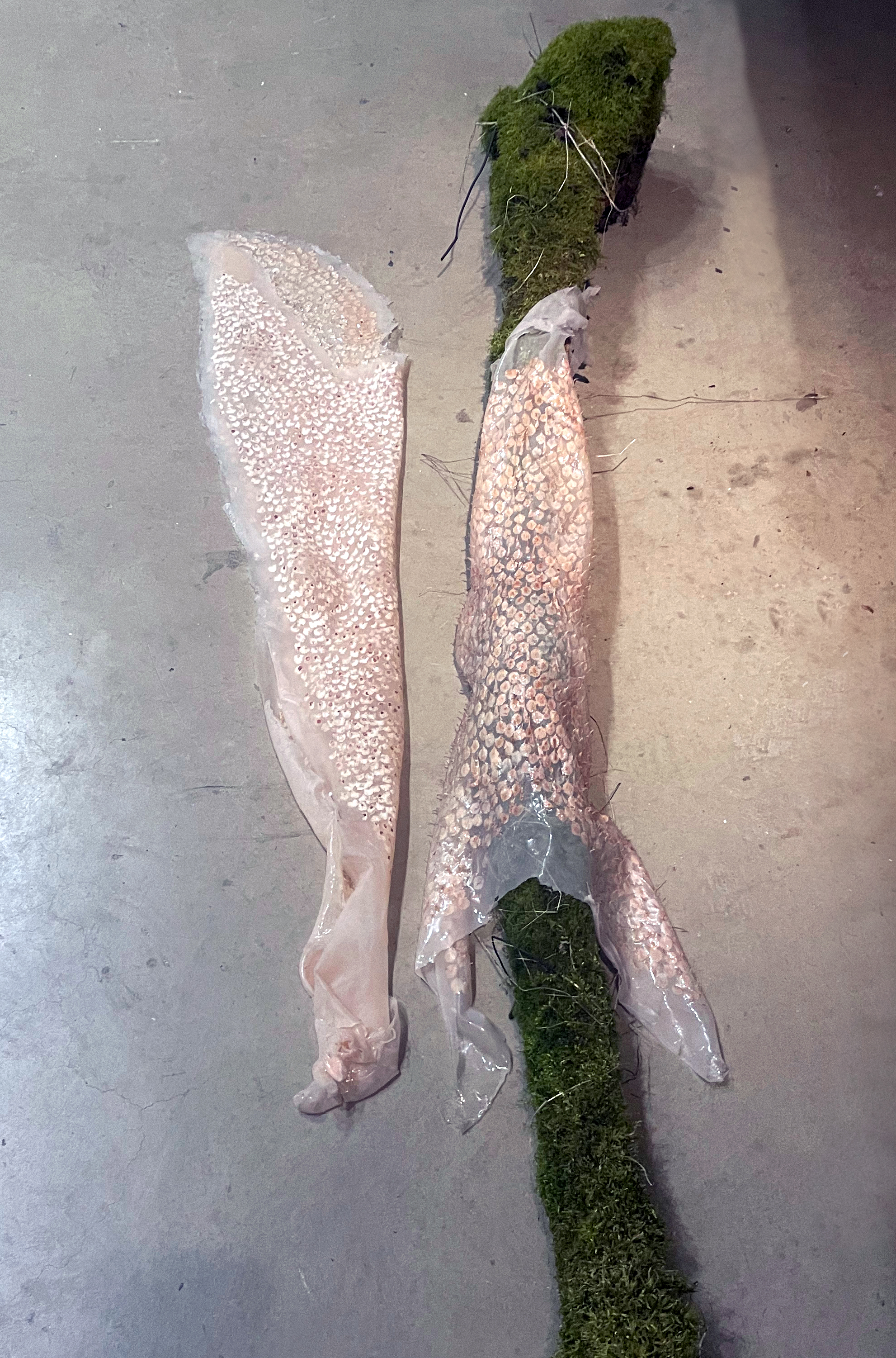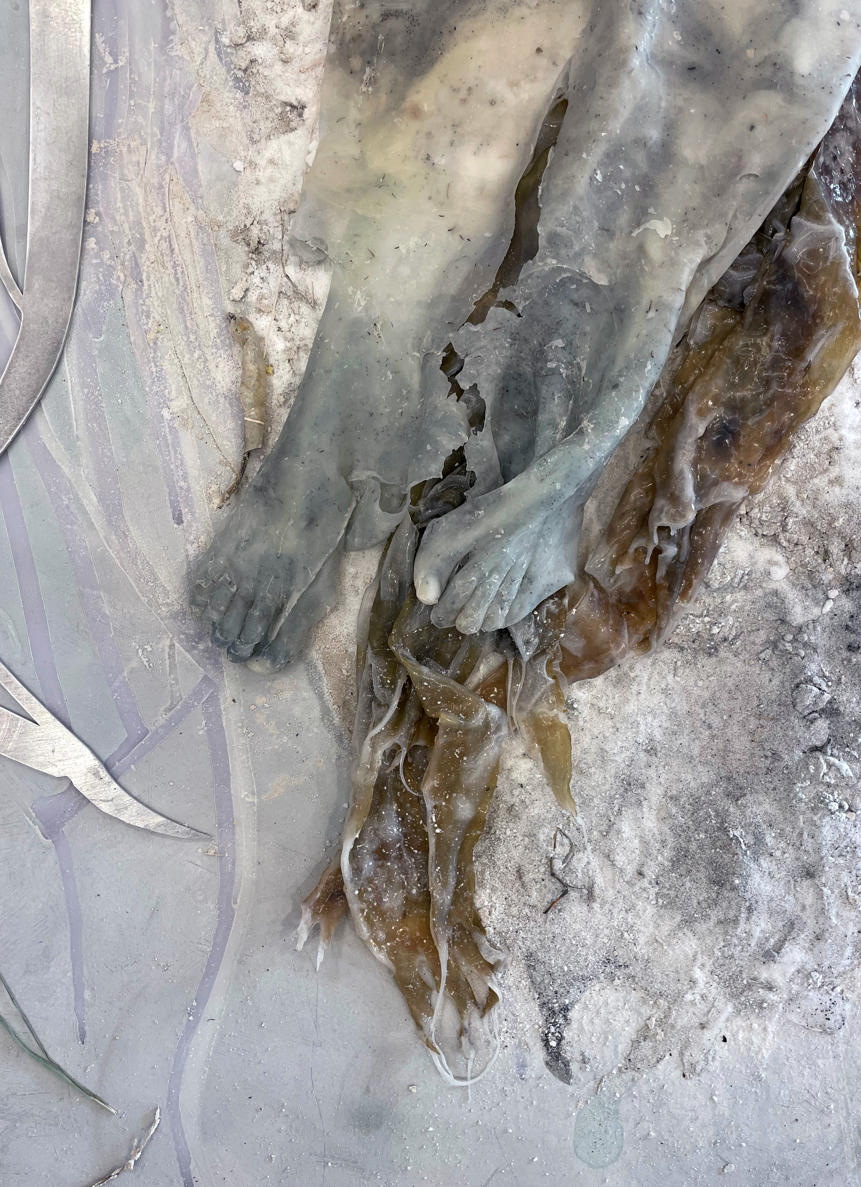 Tiddy Munn (detail), 2023. Limestone, peat, kelp, salt, sylvite, silicone, chalk, quartz, albite, bearthite, dolomite, marl, jesmonite, wax, aluminium, algae, chalk. 320 x 85 x 35cm approx.