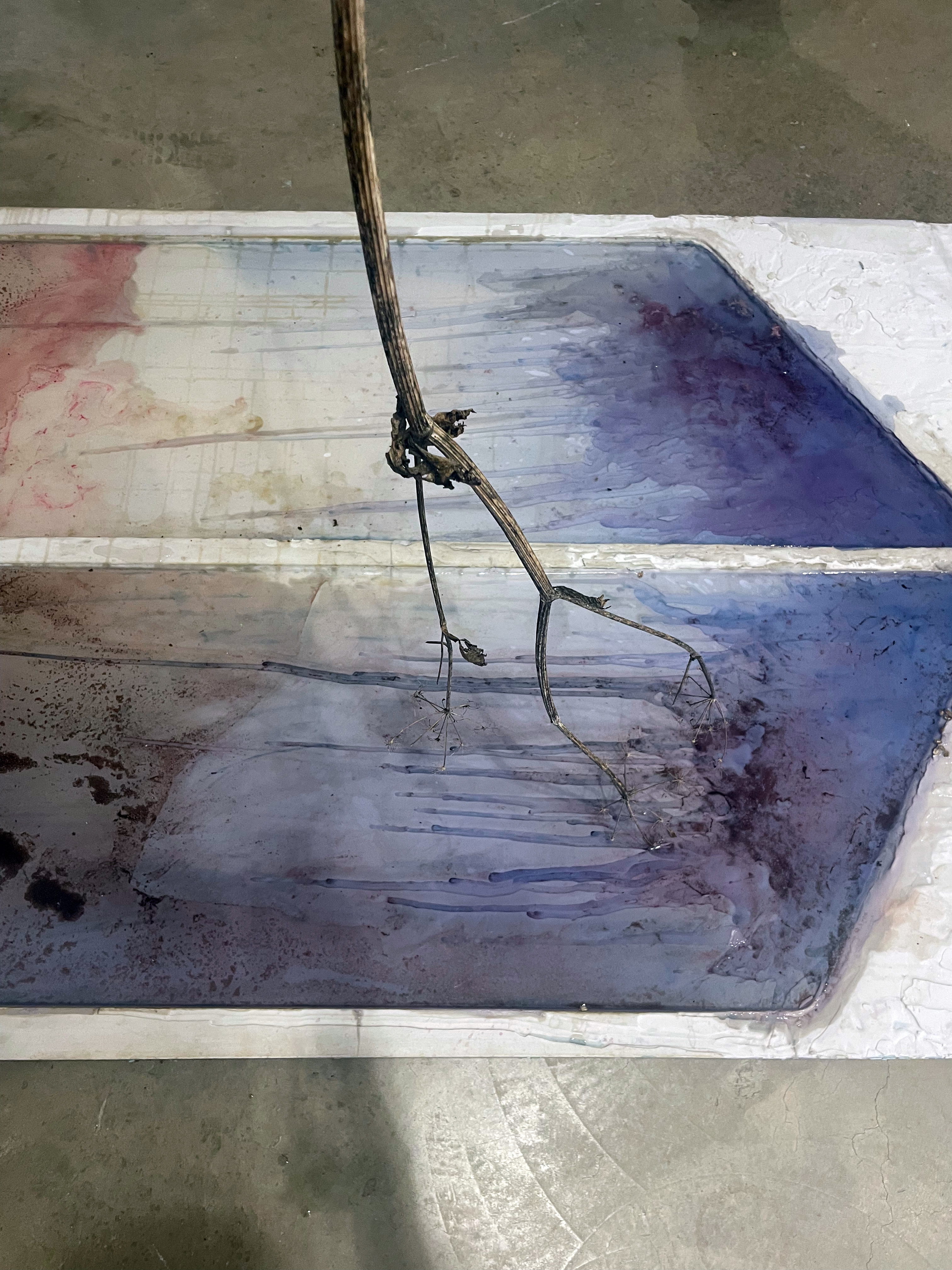Cutter Suction II (detail), 2023. Hemlock, kerosine, salt, algae, aluminium, jesmonite, wax, water from the River Great Ouse. 200 x 150 x 300cm approx.