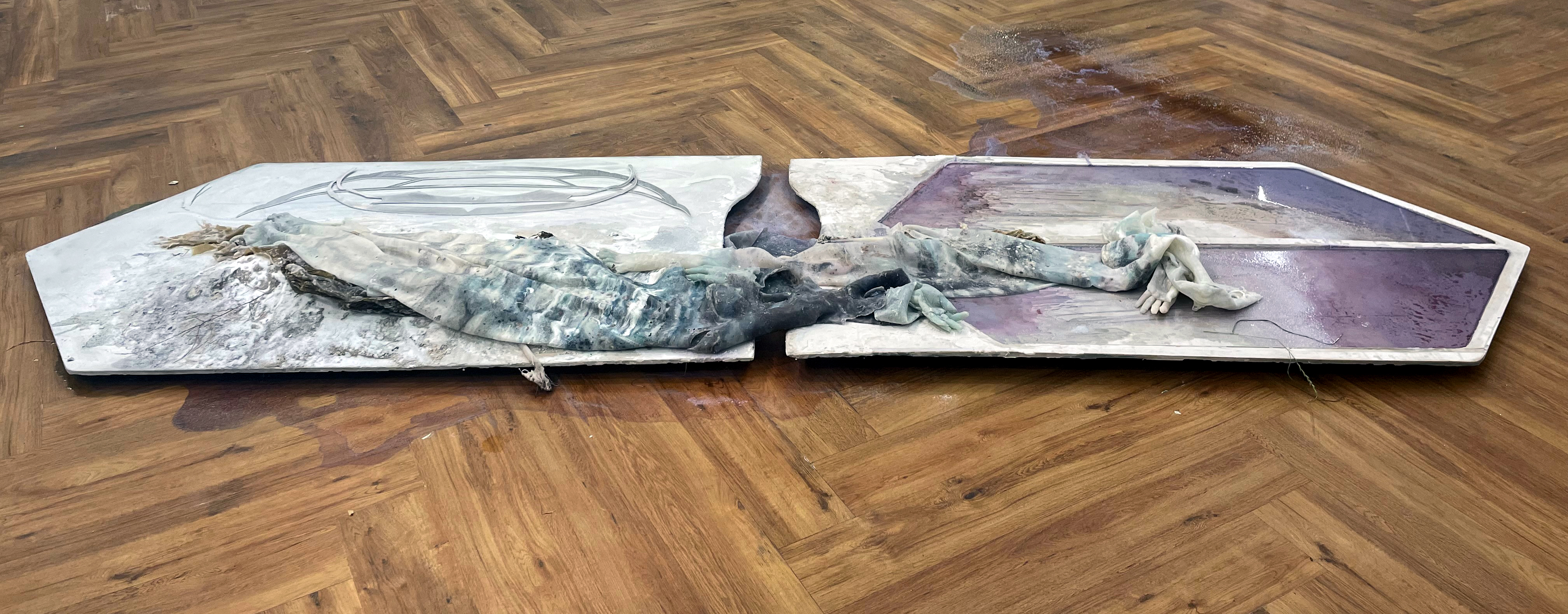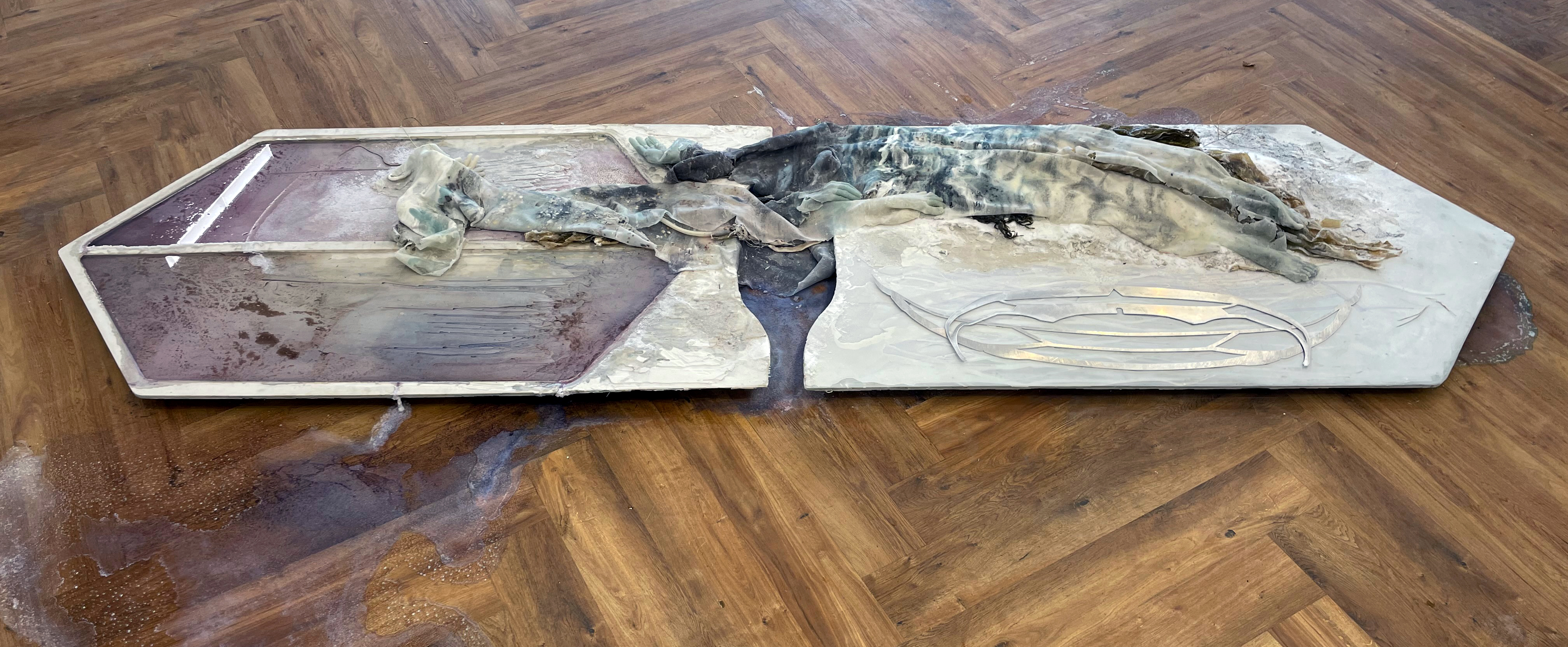 Tiddy Munn, 2023. Limestone, peat, kelp, salt, sylvite, silicone, chalk, quartz, albite, bearthite, dolomite, marl, jesmonite, wax, aluminium, algae, chalk. 320 x 85 x 35cm approx.